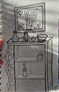I was drawing this picture and couldn’t help but think about the items on the shelves. All of the items are special. Some are from loved ones who passed on, some were found in antique shops, some were gifts and some represent special times with loved ones. As I was trying to think about what I should draw to make it so there weren’t empty spaces on the shelves, I found that I couldn’t come up with what to add. Eventually, I decided I would leave them as empty spaces on the shelves.